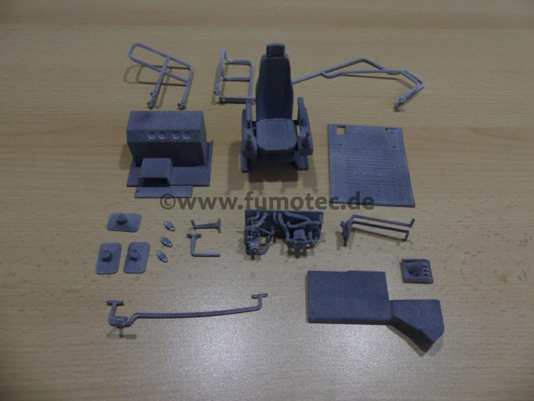 Der besonders detaillierte Aufbau des Oberwagens ist komplett montagefertig in 3D-Druck-Technik hergestellt und mit passgenauen Führungsstiften versehen. Dabei werden Teile der Verkleidung mit Magneten fixiert.